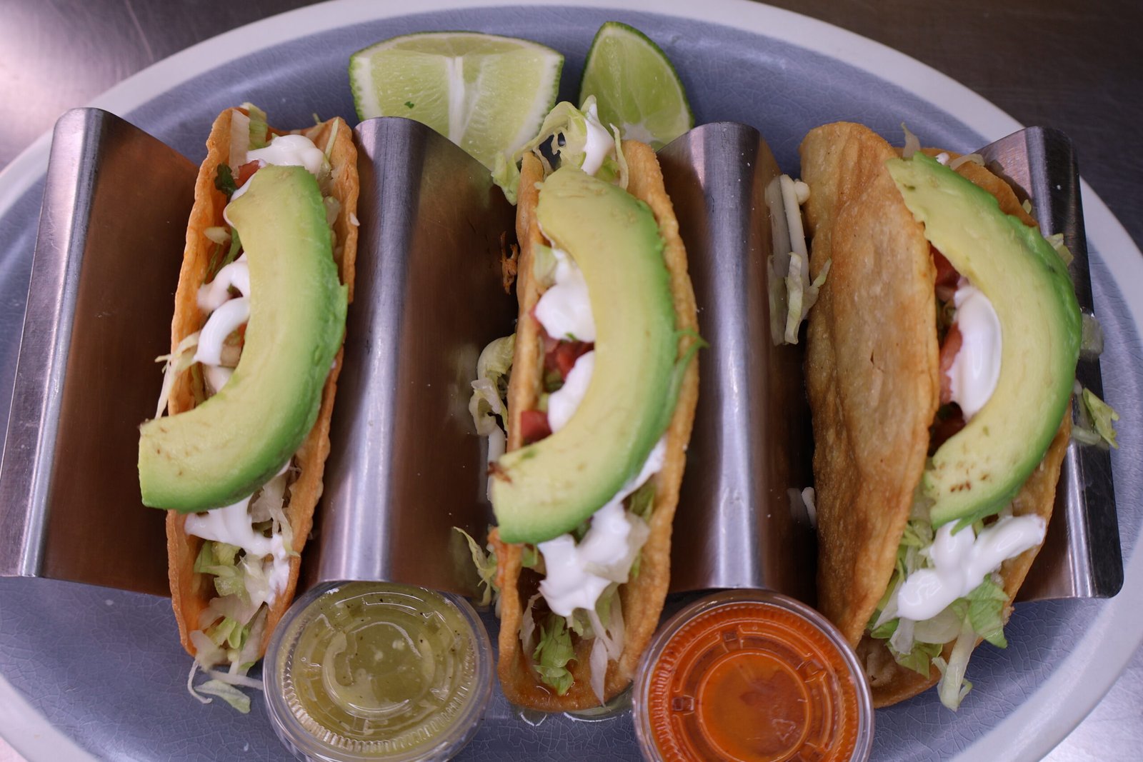 Comes with 3 tacos, lettuce, cheese, pico de gallo, sour cream, avocado. lime, salsa roja y verde on the side.